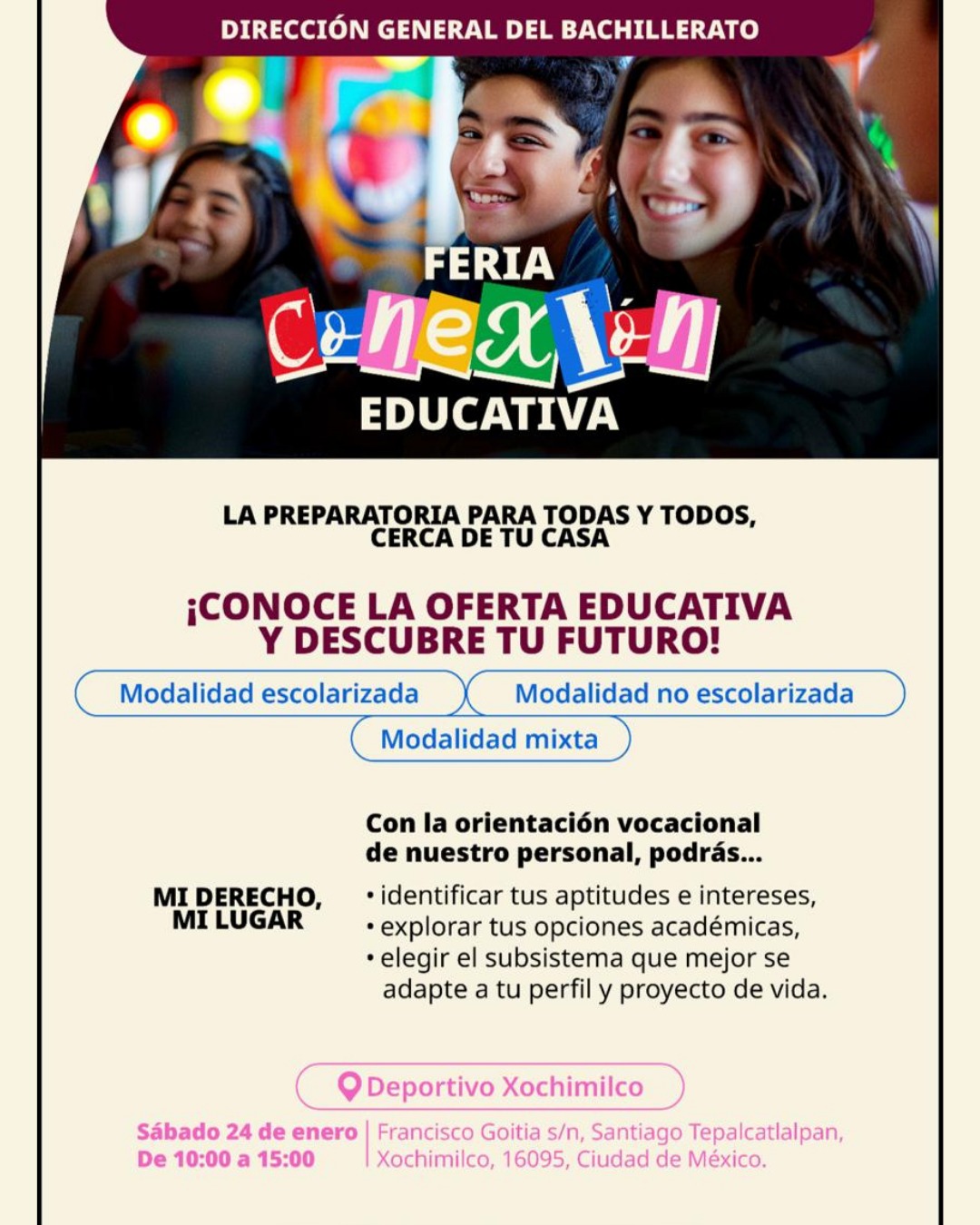21 de enero de 2026 ¡Atención comunidad de Preparatoria Abierta! Te invitamos a la Feria Conexión Educativa de la DGB. Si buscas opciones para continuar o fortalecer tu trayecto educativo, ¡este evento es para ti! 📍 ¿Dónde? Deportivo Xochimilco (Francisco Goitia s/n, Xochimilco). 🗓️ ¿Cuándo? Sábado 24 de enero. 🕙 Horario: 10:00 a 15:00 horas. ¡Descubre tu futuro y asegura tu lugar! 🚀📚 09 de enero de 2026 ¿Las matemáticas te resultan difíciles? ¡Te ayudamos a resolverlas! 💡 Te esperamos en nuestras sesiones de asesoría virtual. Aprovecha este espacio diseñado especialmente para apoyarte en tu aprendizaje. 🗓 ¿Cuándo? Martes y Jueves 🕓 Horario: 18:30 a 20:00 h 🔗 Acceso directo a la videoconferencia:👇 09 de enero de 2026 🔬 ¡Lleva tus conocimientos de Ciencias al siguiente nivel! Te invitamos a nuestras asesorías virtuales. Es el espacio ideal para resolver dudas, realizar experimentos mentales y dominar los temas de Ciencias Experimentales con el apoyo de especialistas. 🗓 ¿Cuándo? Lunes y viernes 🕓 Horario: 16:00 a 17:00 h 🔗 Acceso directo a la videoconferencia:👇 25 de noviembre de 2025 🏃♀️ Fundamentos del entrenamiento deportivo: principios, métodos y cargas. Dirigido a docentes de deporte en educación media superior. ➡️ Inscríbete aquí:👇 24 de septiembre de 2025 ¡En Preparatoria Abierta, construimos un futuro sin violencia. 🏫✨Nos unimos a la Declaratoria de Cero Tolerancia para asegurar que toda nuestra comunidad sea un espacio seguro y libre de cualquier tipo de violencia. Creemos que el respeto es la regla fundamental para aprender y crecer en amonía.💪 ¡Te invitamos a ser parte de este movimiento! #MiEscuelaLibreDeViolencia 🖐️ 11 de febrero de 2025 Prevención de adicciones ¡Tu bienestar es lo más importante! 💪 ¿Quieres saber más? Descubre cómo construir un futuro libre de adicciones. 📚 Conoce toda la información aquí 👇