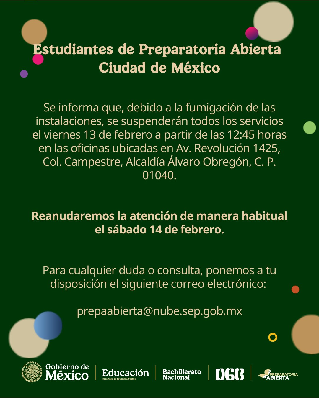 11 de febrero de 2026 ¡Atención, comunidad creativa! 📢🎨 Si eres estudiante de bachillerato, este espacio es para ti. ✅ Exprésate: Crea un cartel con una frase original. ✅ Representa: Dale valor a tus raíces y a tu identidad. ✅ Participa: Tienes hasta el 17 de febrero para enviar tu propuesta. 🗓️ 👉 Escanea el QR para conocer todos los detalles. 09 de enero de 2026 ¿Las matemáticas te resultan difíciles? ¡Te ayudamos a resolverlas! 💡 Te esperamos en nuestras sesiones de asesoría virtual. Aprovecha este espacio diseñado especialmente para apoyarte en tu aprendizaje. 🗓 ¿Cuándo? Martes y Jueves 🕓 Horario: 18:30 a 20:00 h 🔗 Acceso directo a la videoconferencia:👇 09 de enero de 2026 🔬 ¡Lleva tus conocimientos de Ciencias al siguiente nivel! Te invitamos a nuestras asesorías virtuales. Es el espacio ideal para resolver dudas, realizar experimentos mentales y dominar los temas de Ciencias Experimentales con el apoyo de especialistas. 🗓 ¿Cuándo? Lunes y viernes 🕓 Horario: 16:00 a 17:00 h 🔗 Acceso directo a la videoconferencia:👇 25 de noviembre de 2025 🏃♀️ Fundamentos del entrenamiento deportivo: principios, métodos y cargas. Dirigido a docentes de deporte en educación media superior. ➡️ Inscríbete aquí:👇 24 de septiembre de 2025 ¡En Preparatoria Abierta, construimos un futuro sin violencia. 🏫✨Nos unimos a la Declaratoria de Cero Tolerancia para asegurar que toda nuestra comunidad sea un espacio seguro y libre de cualquier tipo de violencia. Creemos que el respeto es la regla fundamental para aprender y crecer en amonía.💪 ¡Te invitamos a ser parte de este movimiento! #MiEscuelaLibreDeViolencia 🖐️ 11 de febrero de 2025 Prevención de adicciones ¡Tu bienestar es lo más importante! 💪 ¿Quieres saber más? Descubre cómo construir un futuro libre de adicciones. 📚 Conoce toda la información aquí 👇